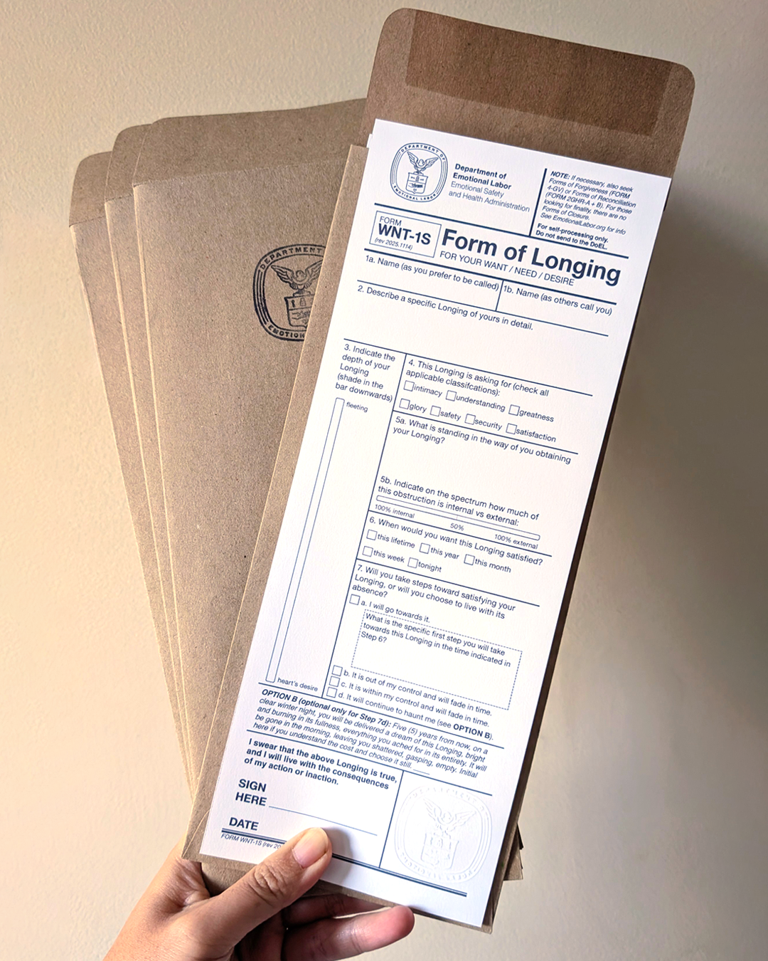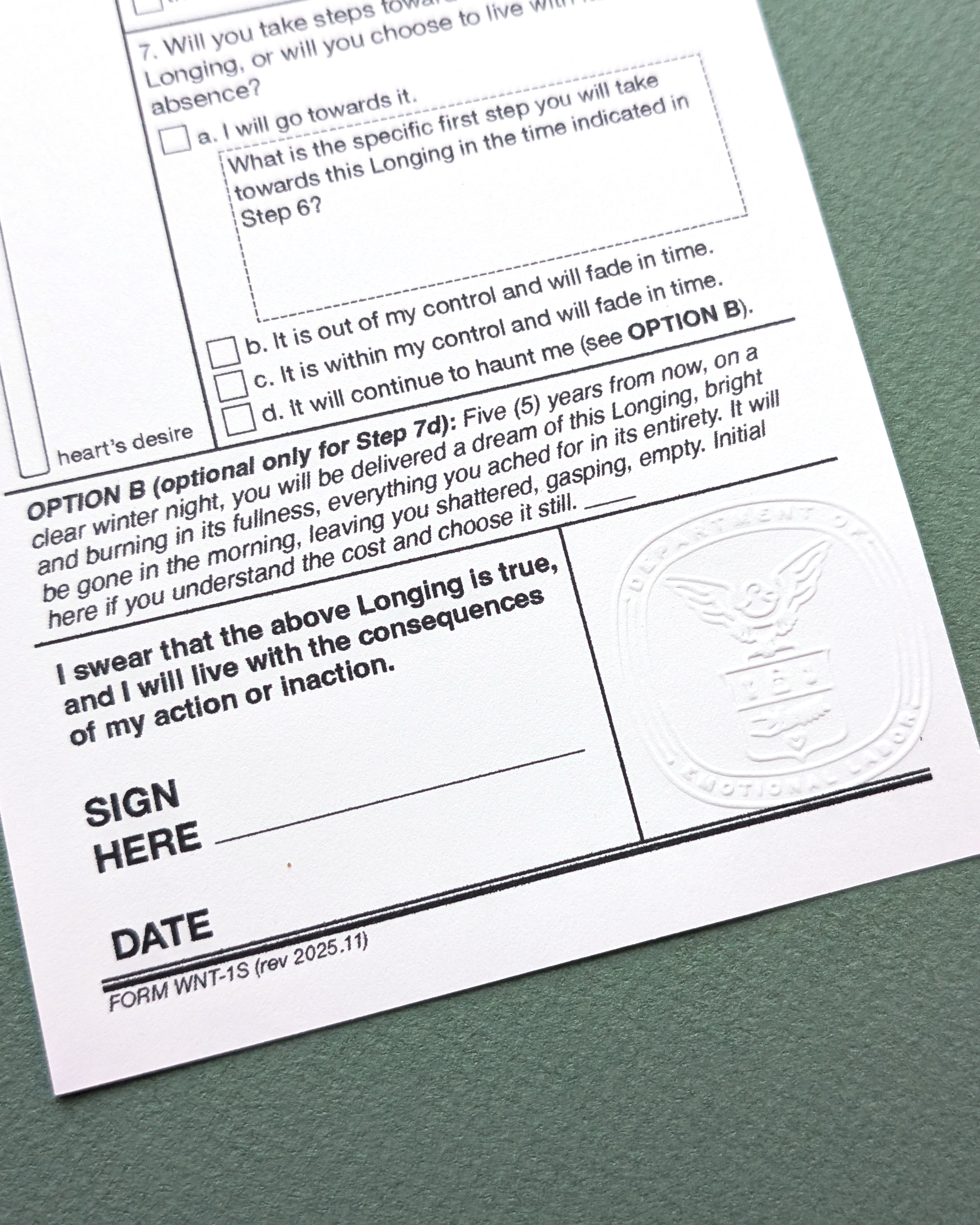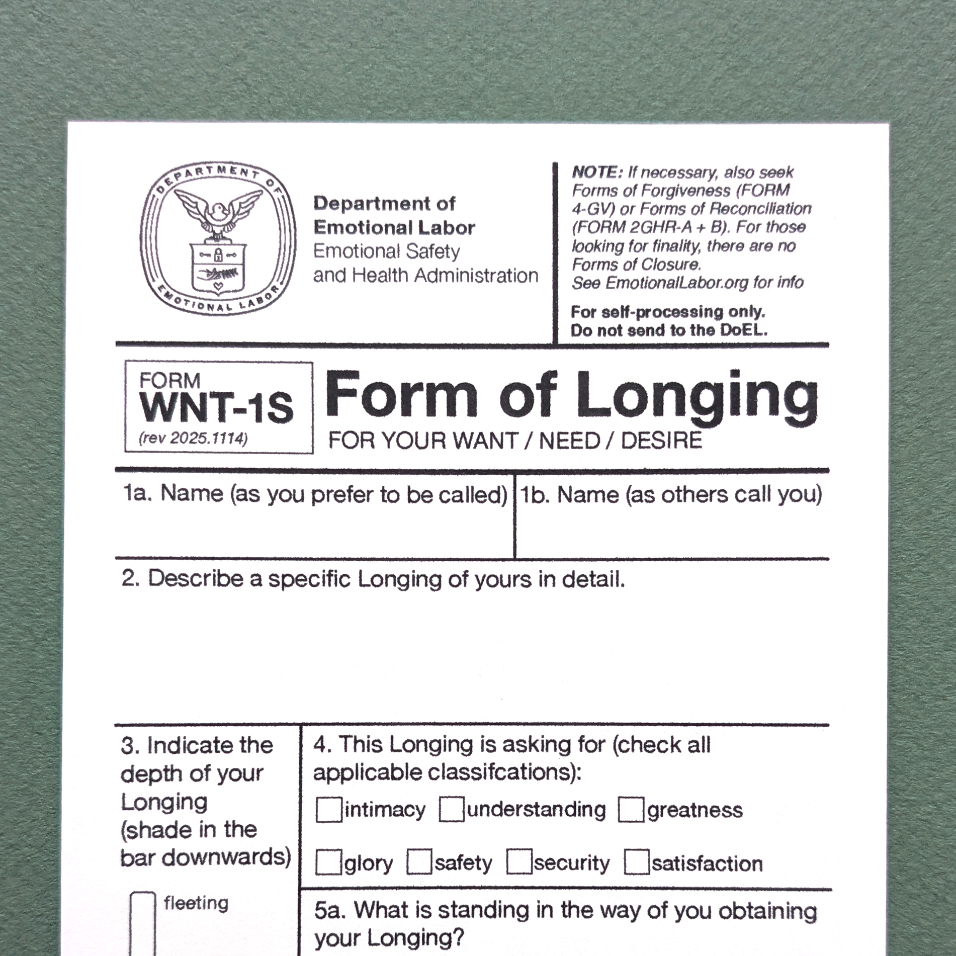 The Form of Longing (Form WNT-1S), a seven-step process for naming, identifying, and processing your want, craving, or desire. Presented as part of the Department of Emotional Labor (2019, returning 2026).